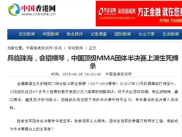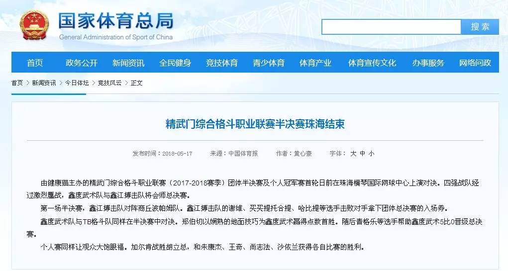 2018年5月12日,精武門綜合格斗職業(yè)聯(lián)賽(2017—2018賽季)團(tuán)體半決賽在珠海橫琴國際網(wǎng)球中心圓滿落幕。鑫江搏擊3:2險勝商丘波帕姆,成功拿到團(tuán)體總決賽的入場券。