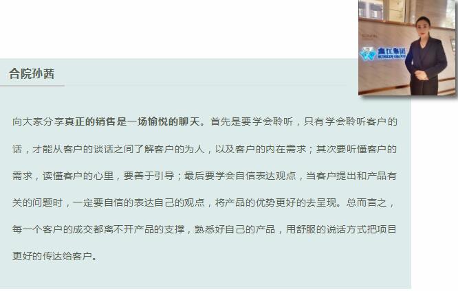 各項目經理也根據自身從業多年的經驗向大家進行了細致入微、引人入勝的分享。他們通過一個個真實、生動的案例展示了自己如何不斷摸索探尋機會,遇到困難絕不后退,鍥而不舍簽約成功等一系列過程。這些成功案例充滿了正能量,也凝聚著汗水與心血,得到了在聽營銷人員的共鳴,贏得了陣陣掌聲。