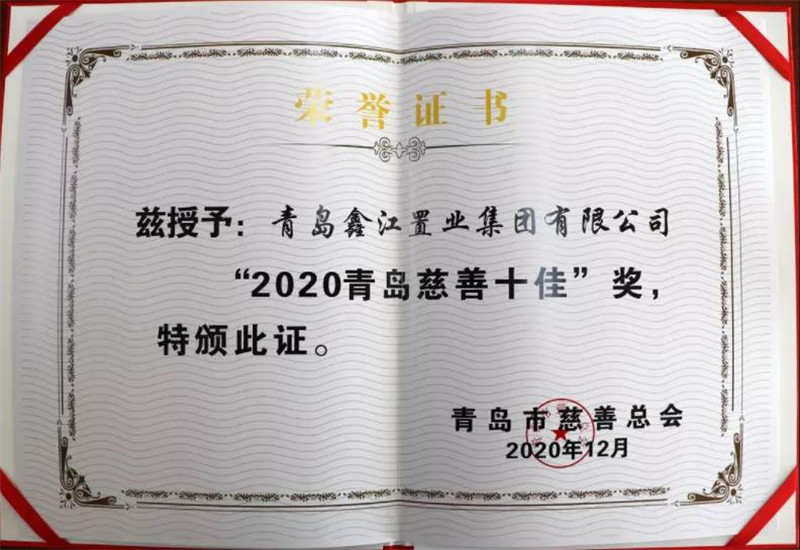 2021年1月,鑫江集團(tuán)在由青島市慈善總會(huì)主辦的2020年度“青島慈善十佳”評(píng)選表彰活動(dòng)中,榮獲“2020 青島慈善十佳”、“抗擊新冠肺炎疫情捐贈(zèng)貢獻(xiàn)獎(jiǎng)”兩項(xiàng)榮譽(yù)。