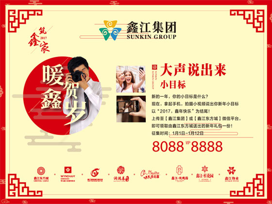 1月1日-1月12日,拍攝小視頻,說出你的新年小目標,以“2017,鑫年快樂“為結尾,上傳至【鑫江集團】或【鑫江東方城】微信公眾號,即可免費領取新年禮包一份,同時,1月21日-27日,【青島東方城】微信公眾號,將開啟在線有獎轉發,轉發視頻圖文至朋友圈,即可免費領取新年好禮一份。
