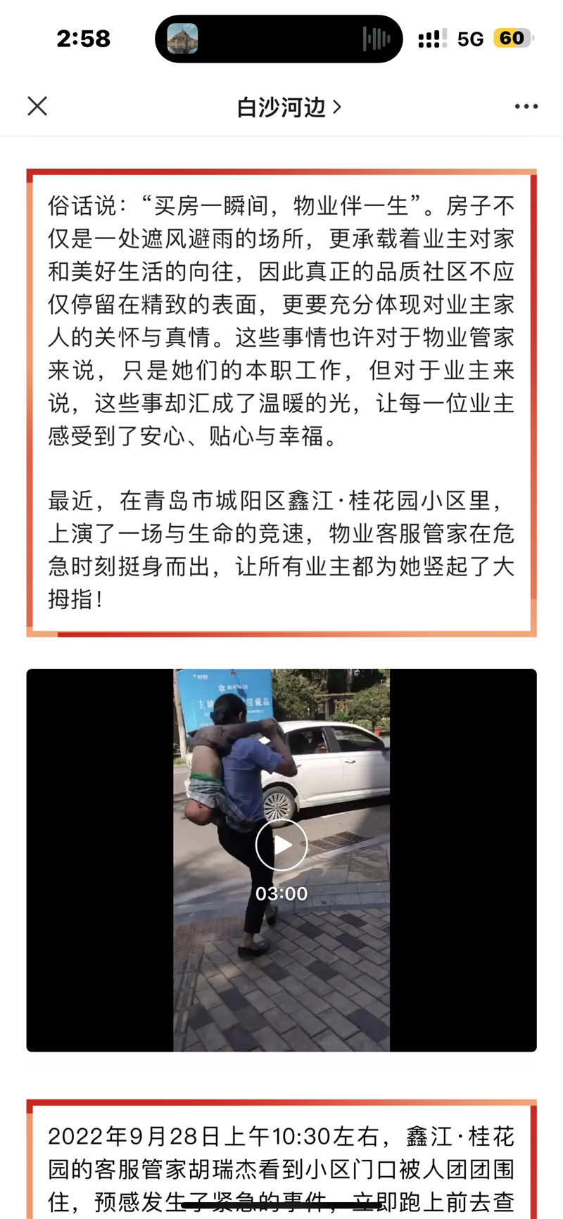 在服務標準之內,提供高品質的暖心服務;在服務標準之外,提供力所能及的幫助,小到搬運物品,大到送醫問診,甚至在業主的生命安全遭到威脅時,能夠第一時間挺身而出,挽救業主生命,將全部的真誠與熱情、愛心與善意匯聚成一股生生不息的守護力量,傾注于業主家人的日常生活里,讓居住體驗更加舒心,也讓幸福美好更有溫度。